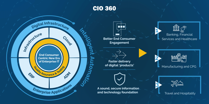 CIOs engage with us to accelerate IT transformation, deliver IT services with a focus on end-user satisfaction, drive IT spend optimization and establish governance with an eye on delivery excellence; leveraging our 360 CIO Services.